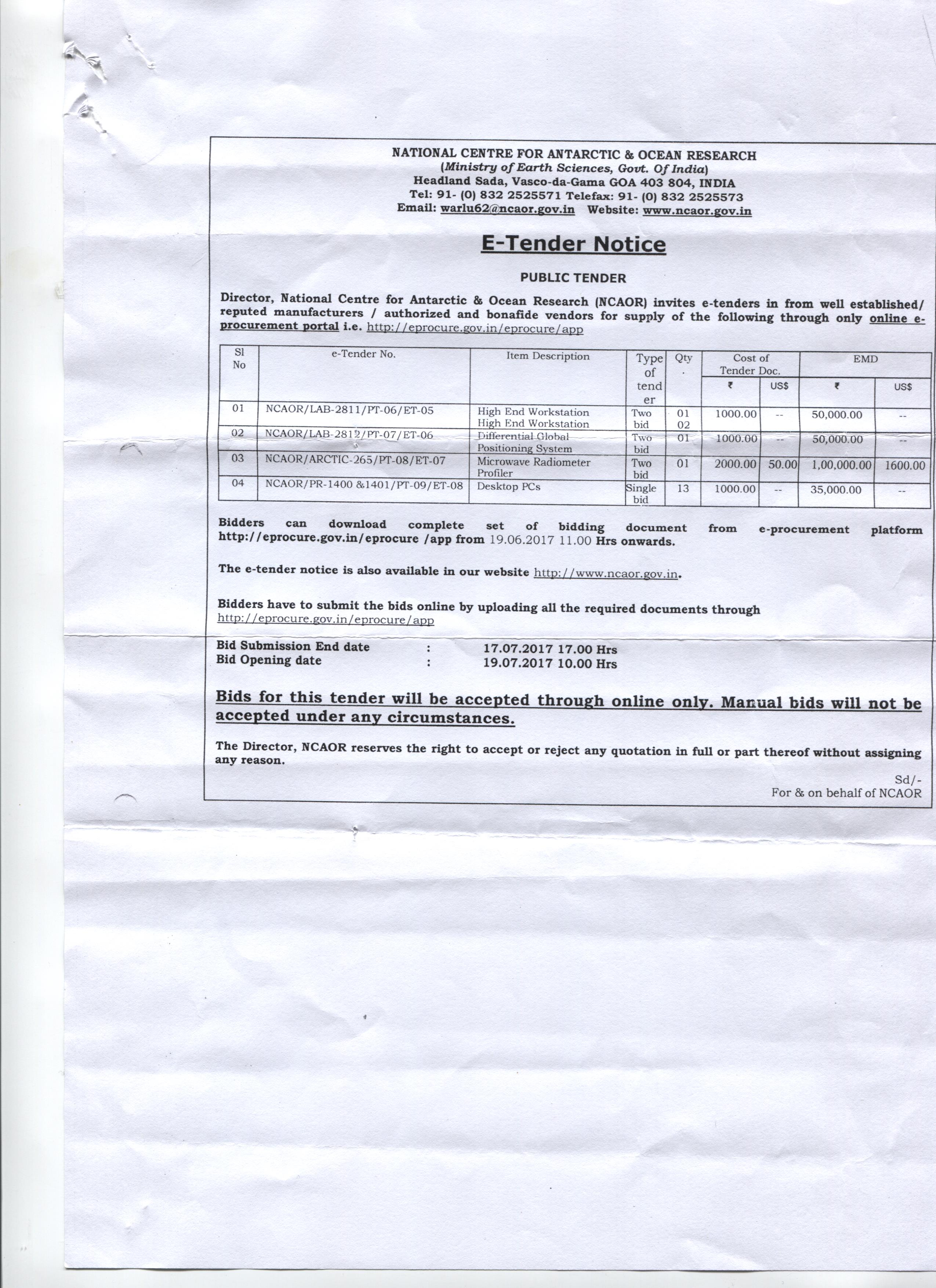 • Tenders by National Centre for Antarctic and Ocean Research